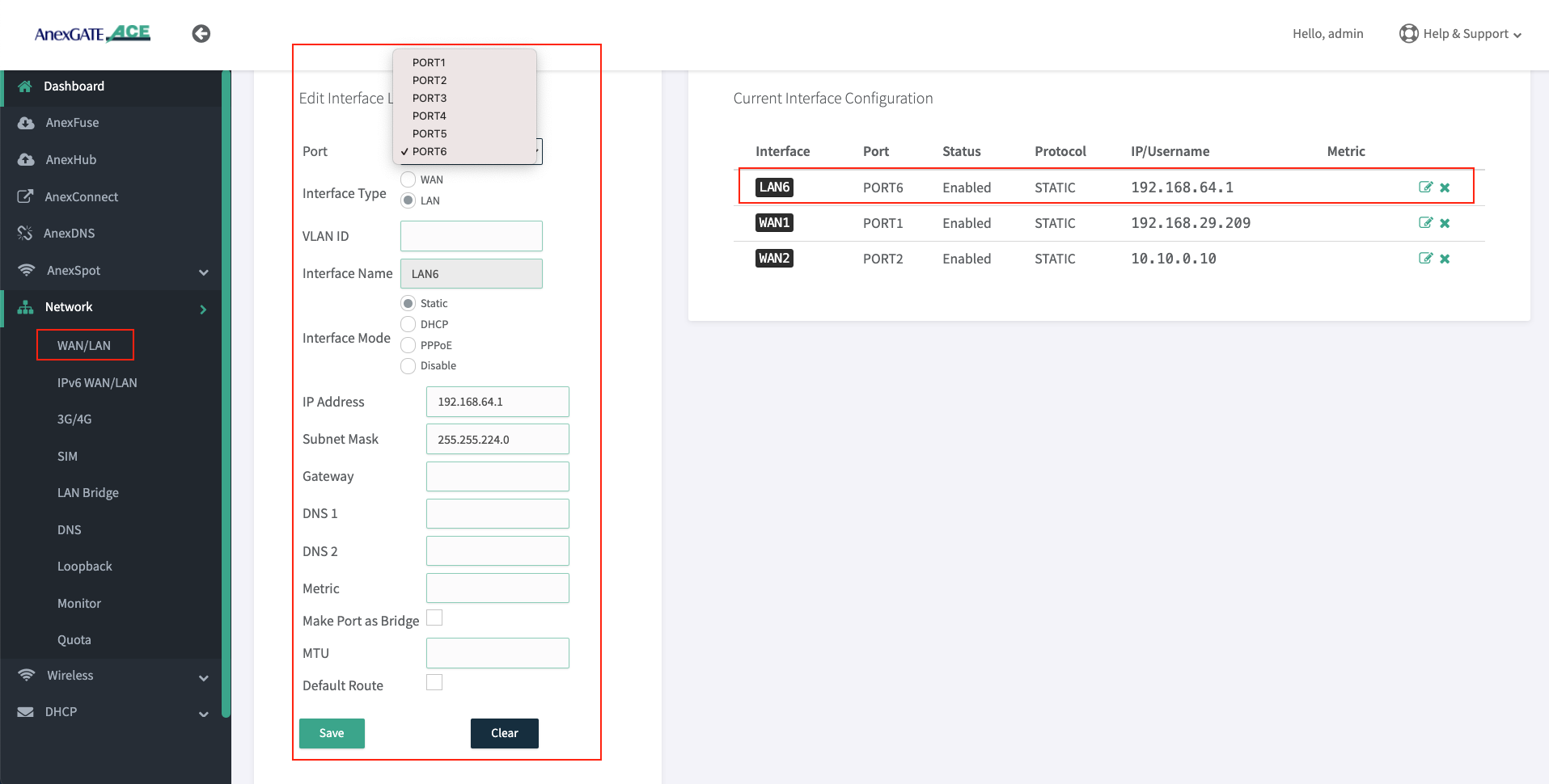 Lan Bridge - To configure LAN Bridge, Go to Network - Lan Bridge.LAN Port - To configure LAN port, go to Network - LAN/WAN.