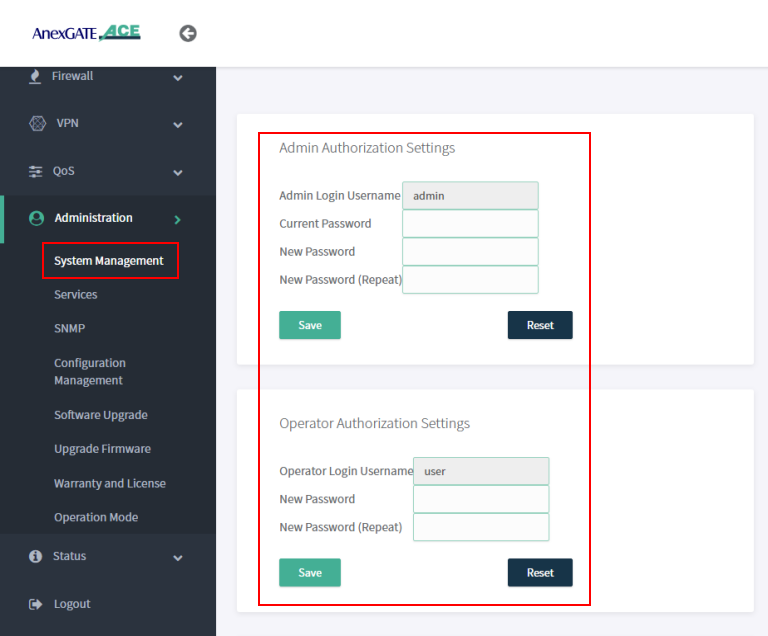 Under System Management, Admin and User password can be changed by entering the current default password and updating to new password accordingly.