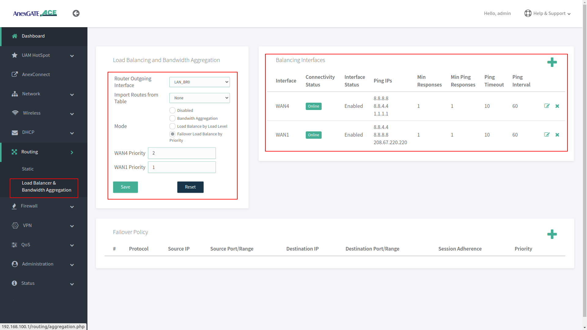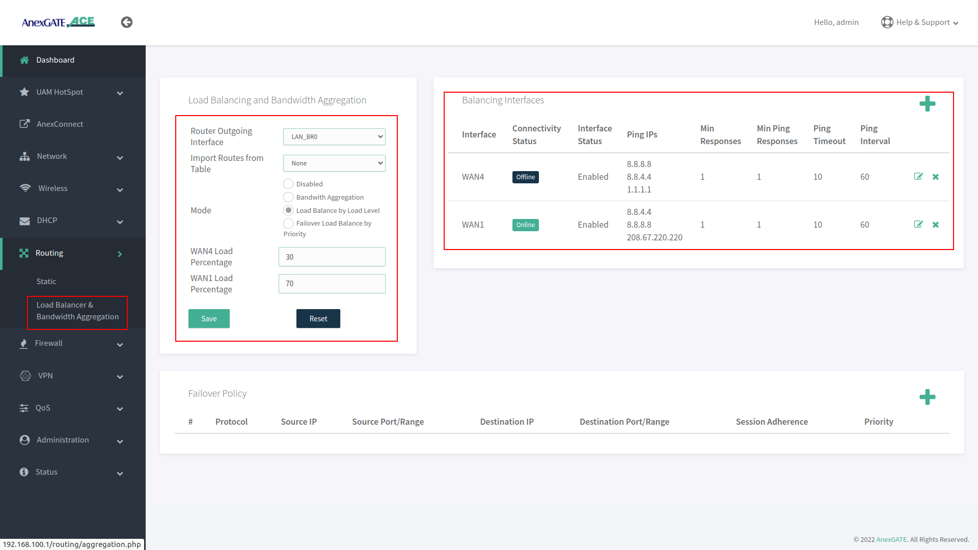 Load Balancing can be performed, if multiple links are being configured. The AnexGATE ACE Router supports 3 modes of Load Balancing.