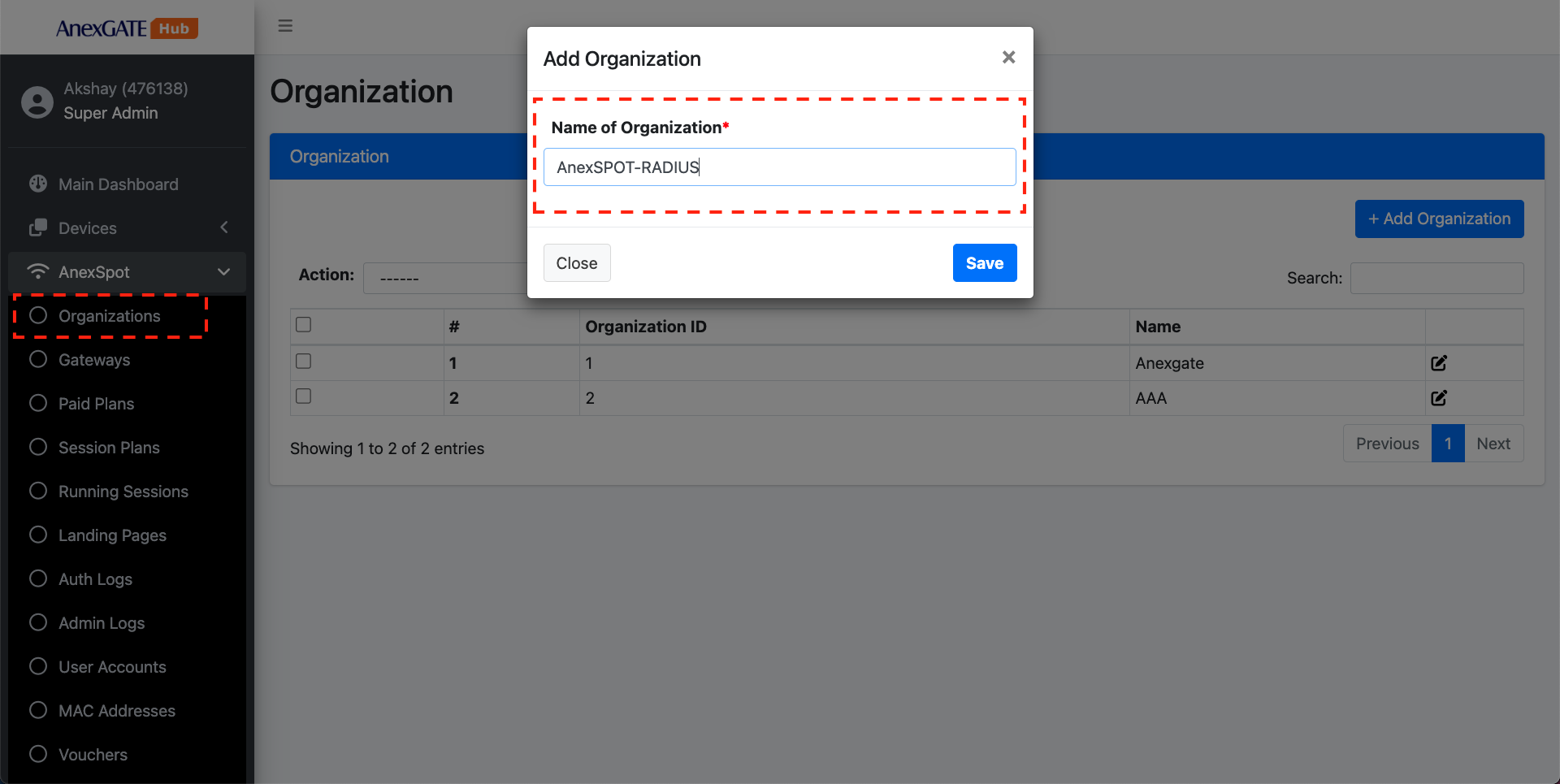 To add an Organisation in AnexSPOT RADIUS,
