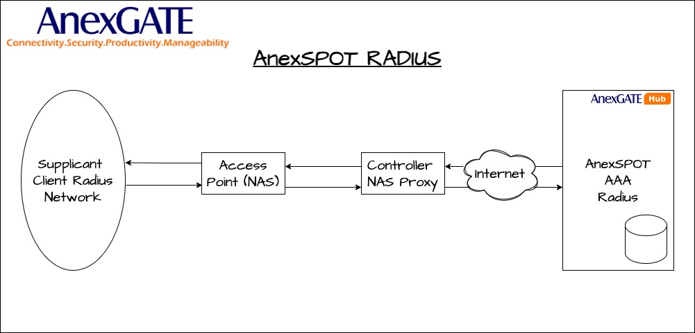 AnexSPOT RADIUS uses RADIUS protocol to serve NAS clients for the access of the network.