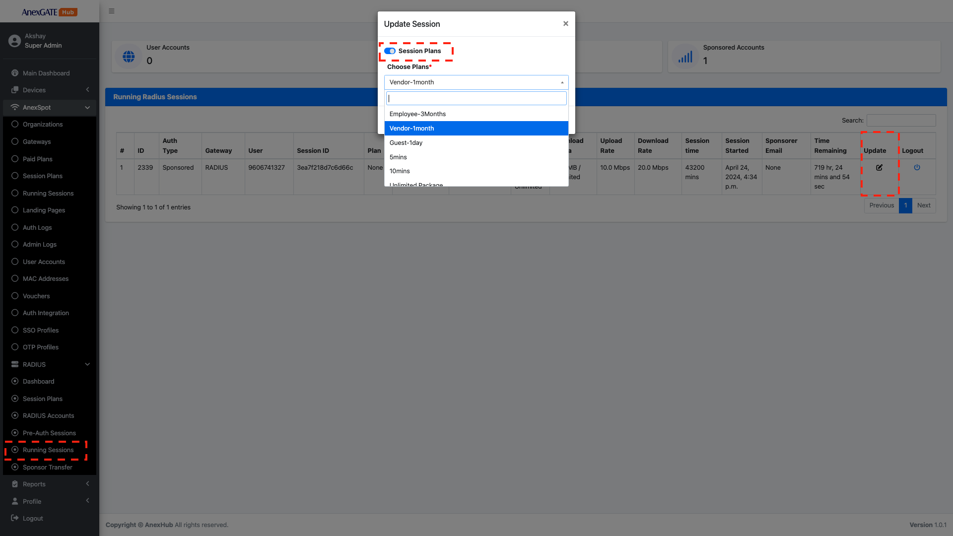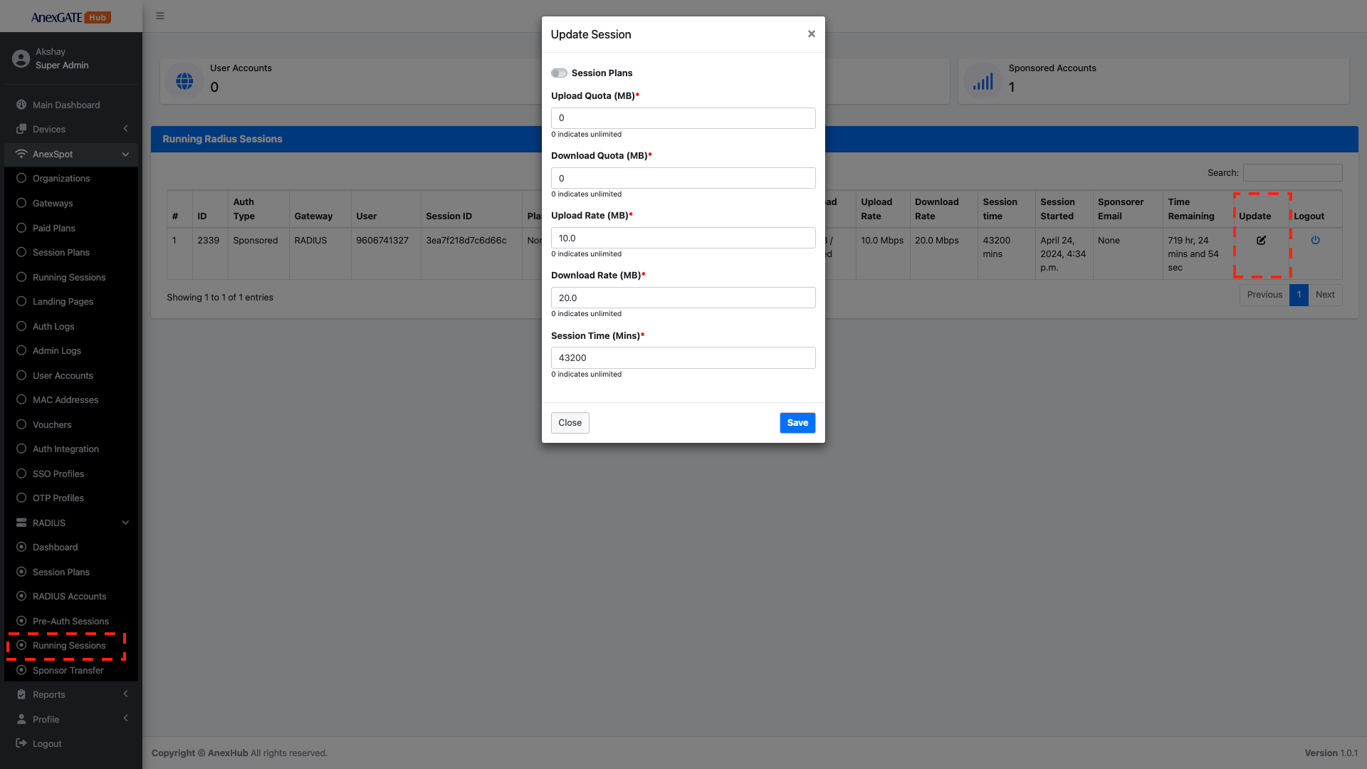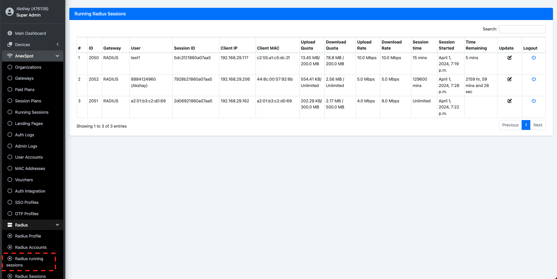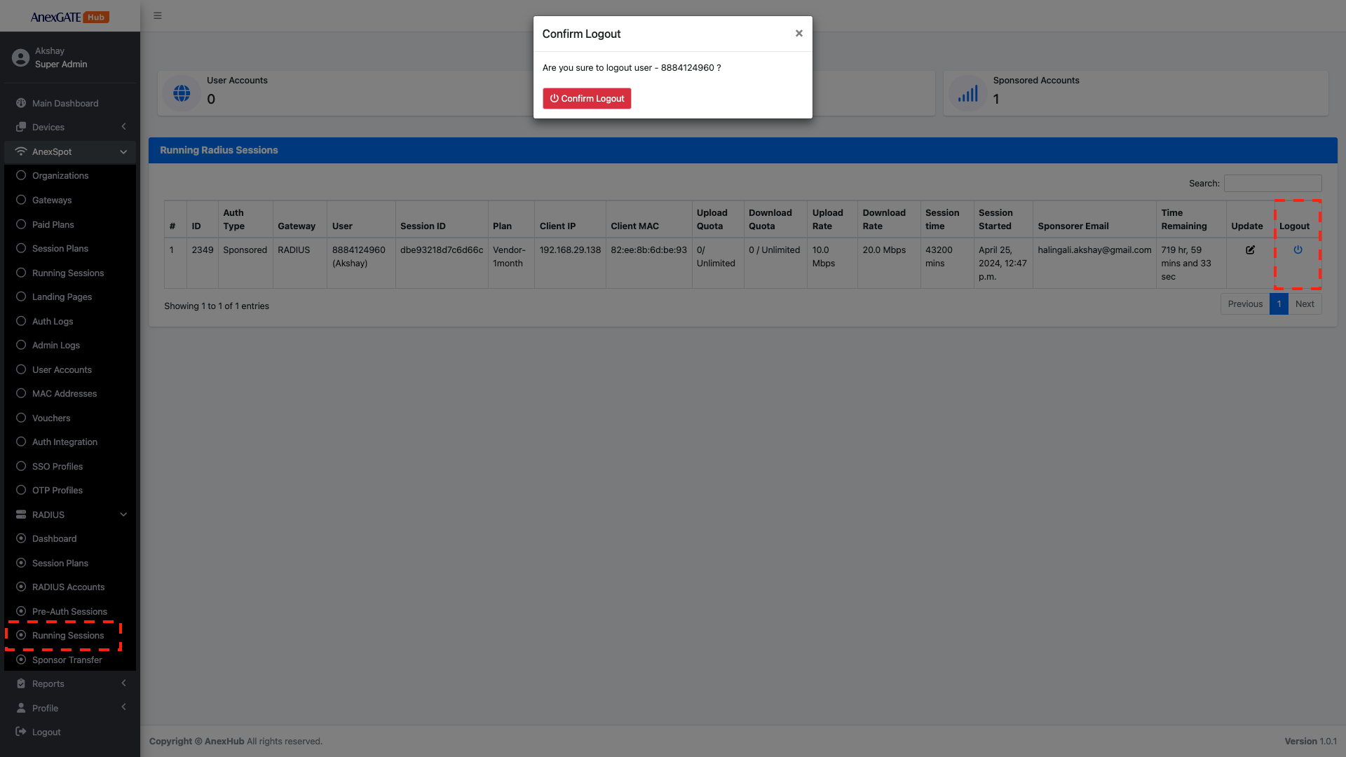 AnexSPOT > Radius > Radius Running SessionsRadius Running Sessions , Click on the Logout Icon locate at the right end of the Running Radius user session parameters.Confirm Logout prompt to successfully force Logout a session from the Admin end.