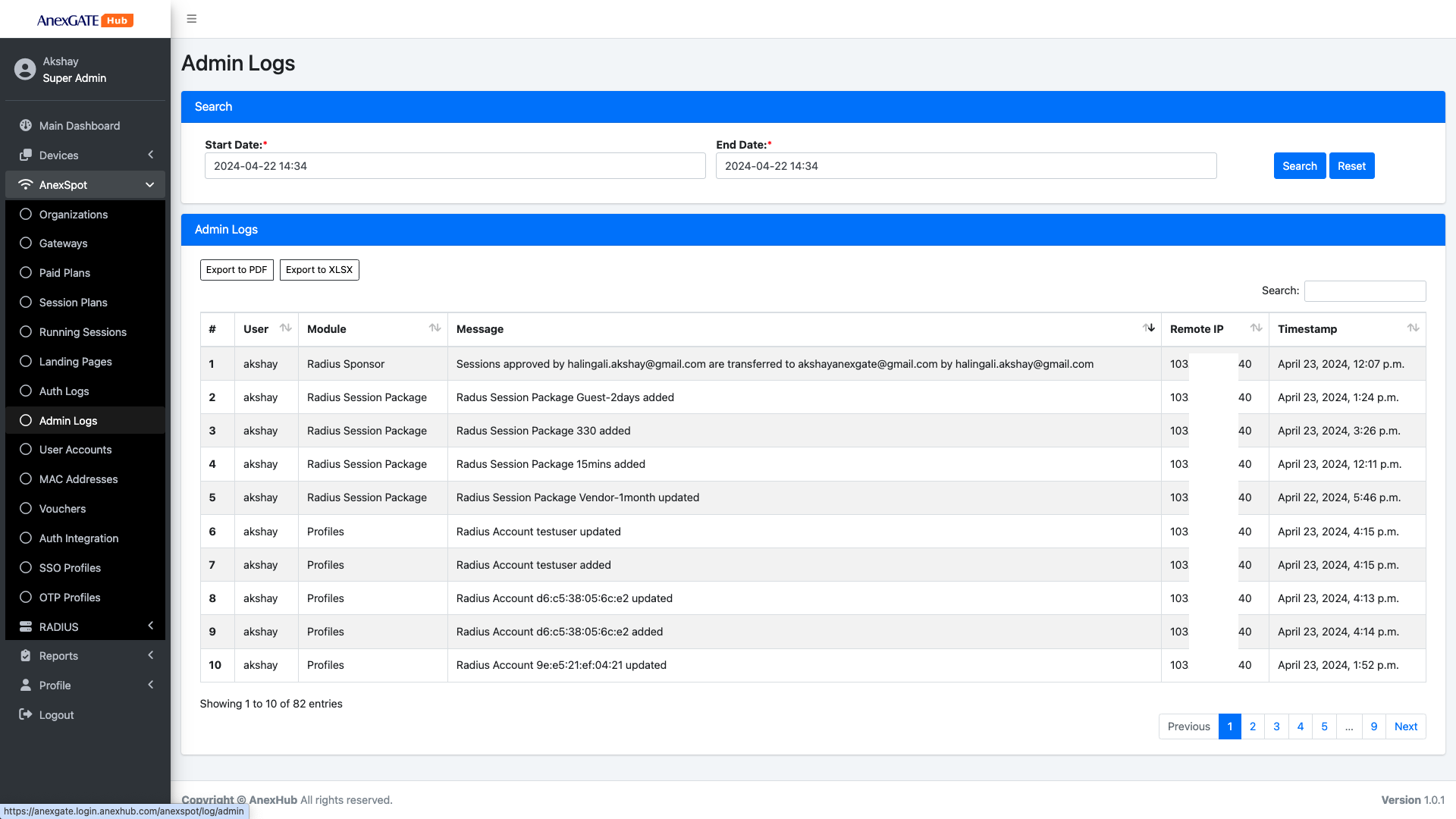 RADIUS Admin Logs maintain the changes performed in with respect to RADIUS Session Plans, Accounts, Sponsor Transfer.