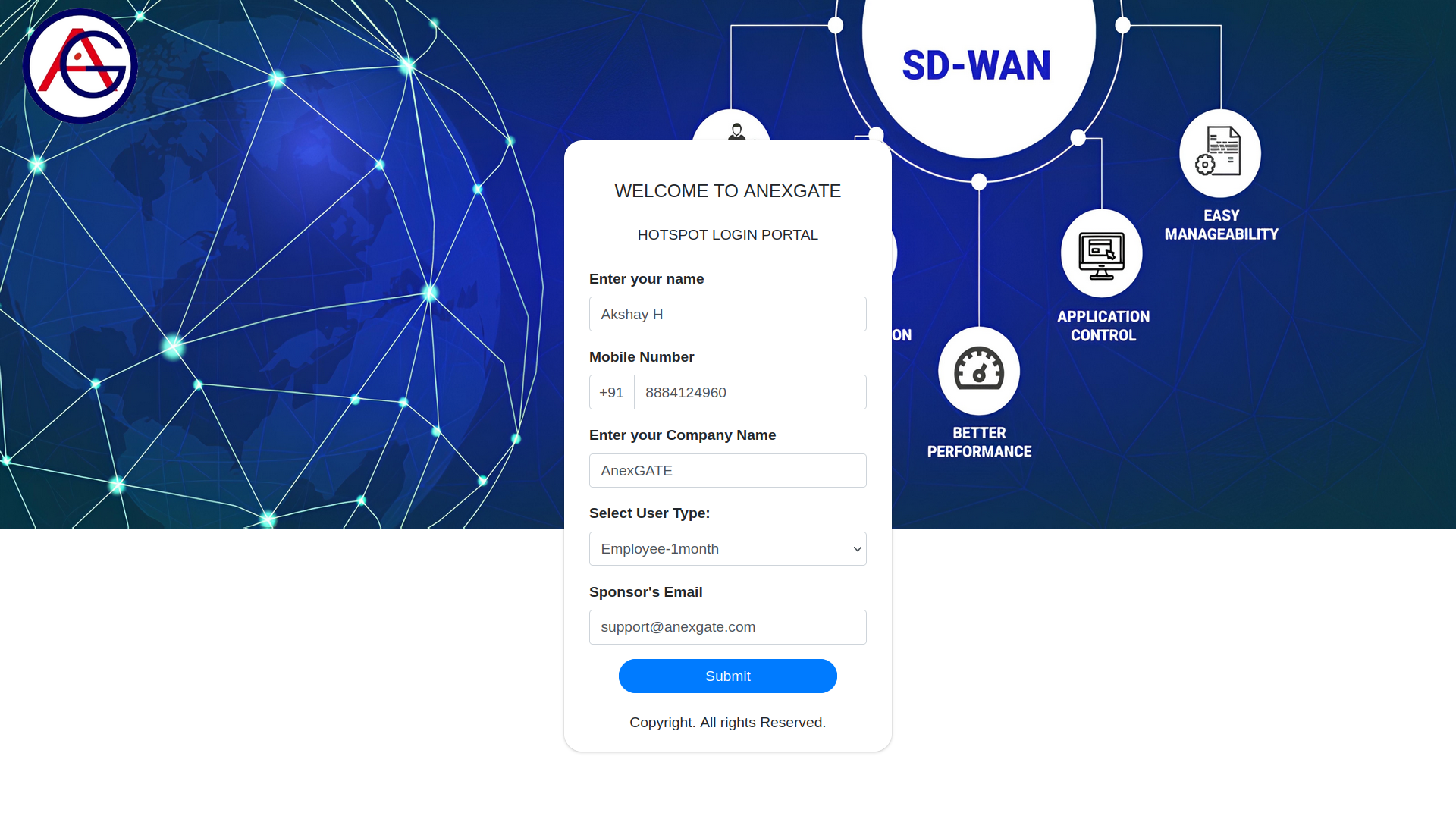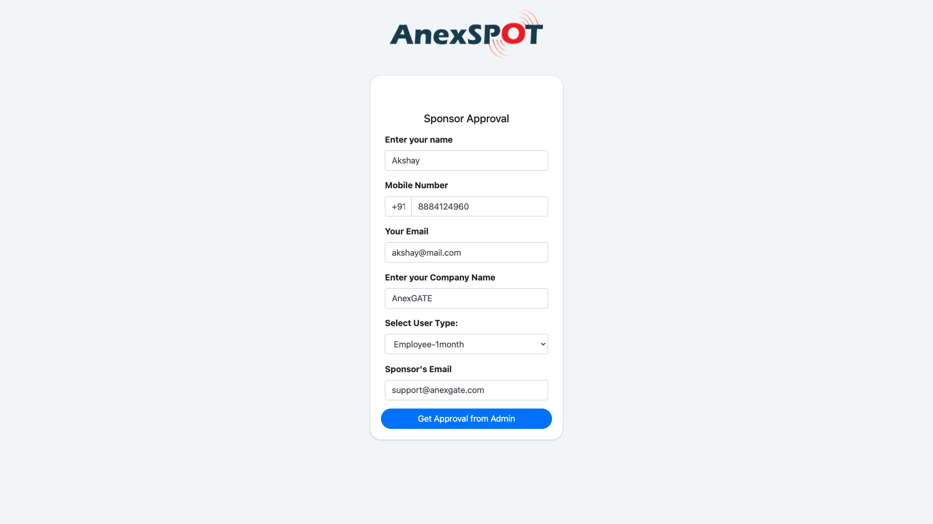 The image shows the Login Page where user has selected the Get Sponsor Approval option to get authenticated from the Sponsor end to access the network. In order to do so, the user requires to fill the required information in the fields as shown below.