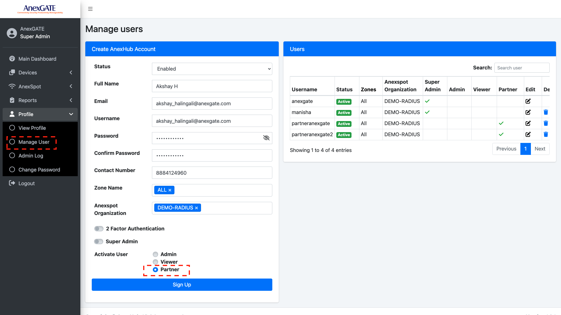 Profile - Manage UserPartner option from Activate User as a login opton for the user account.Sign Up once all the given information are properly validated.Following are the Parameters provided for creating a User Account.