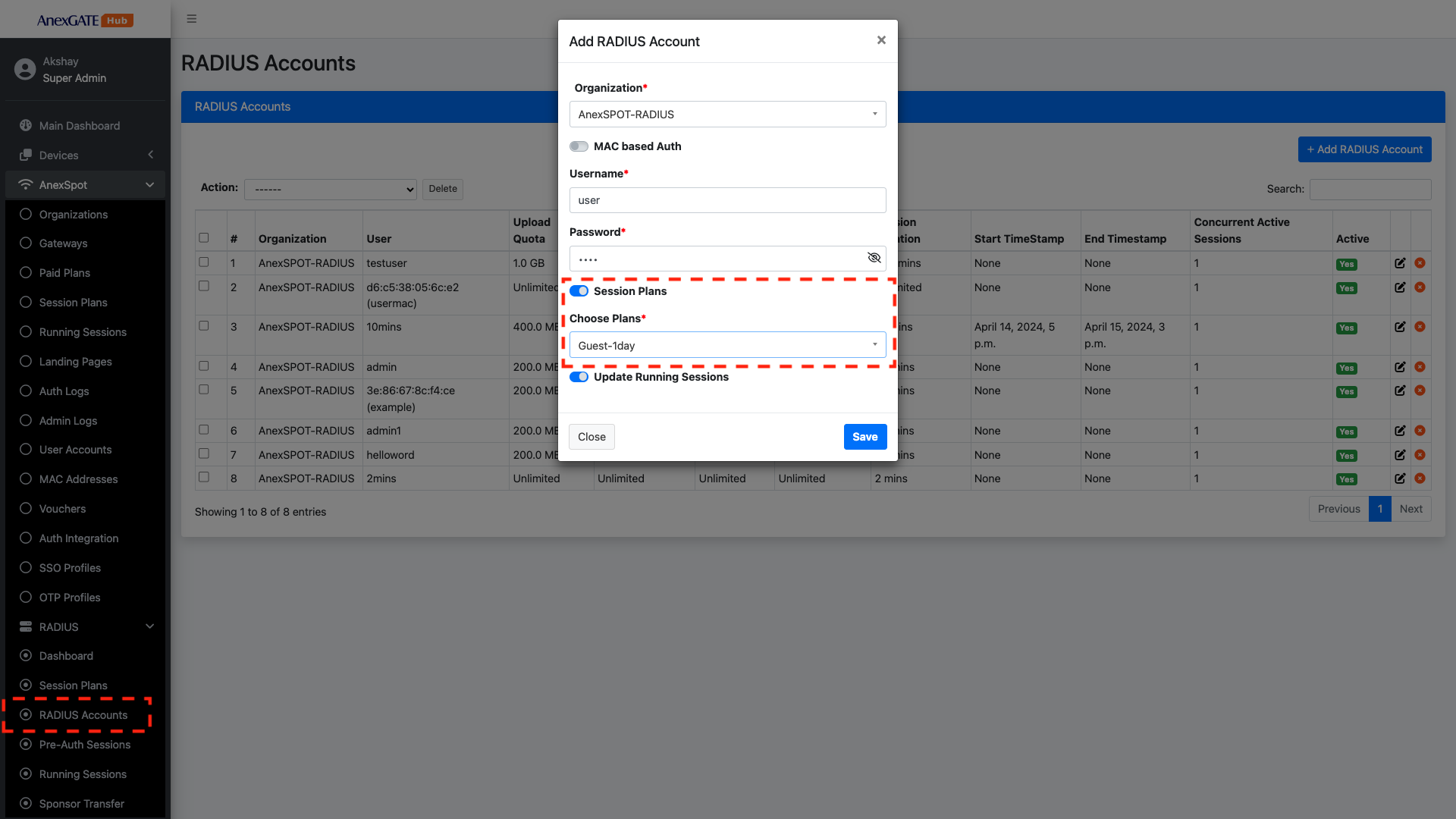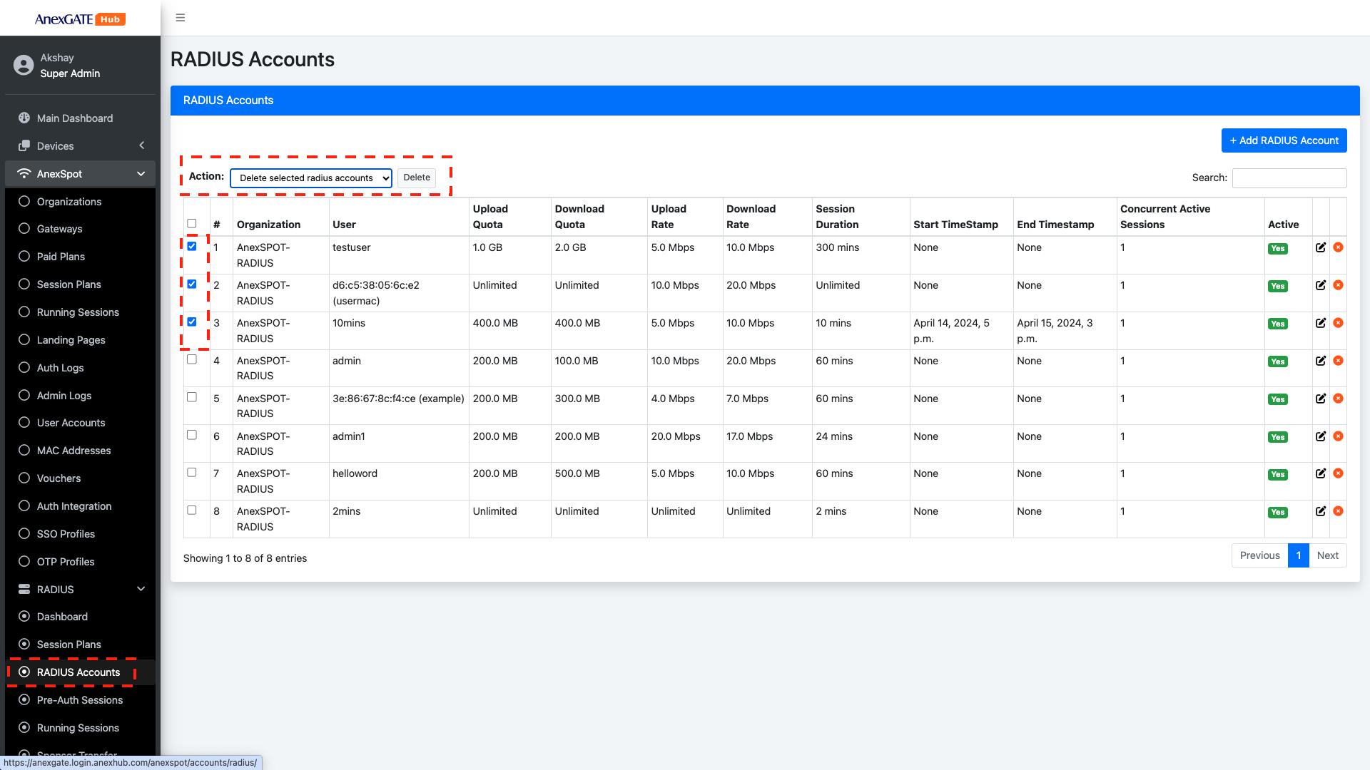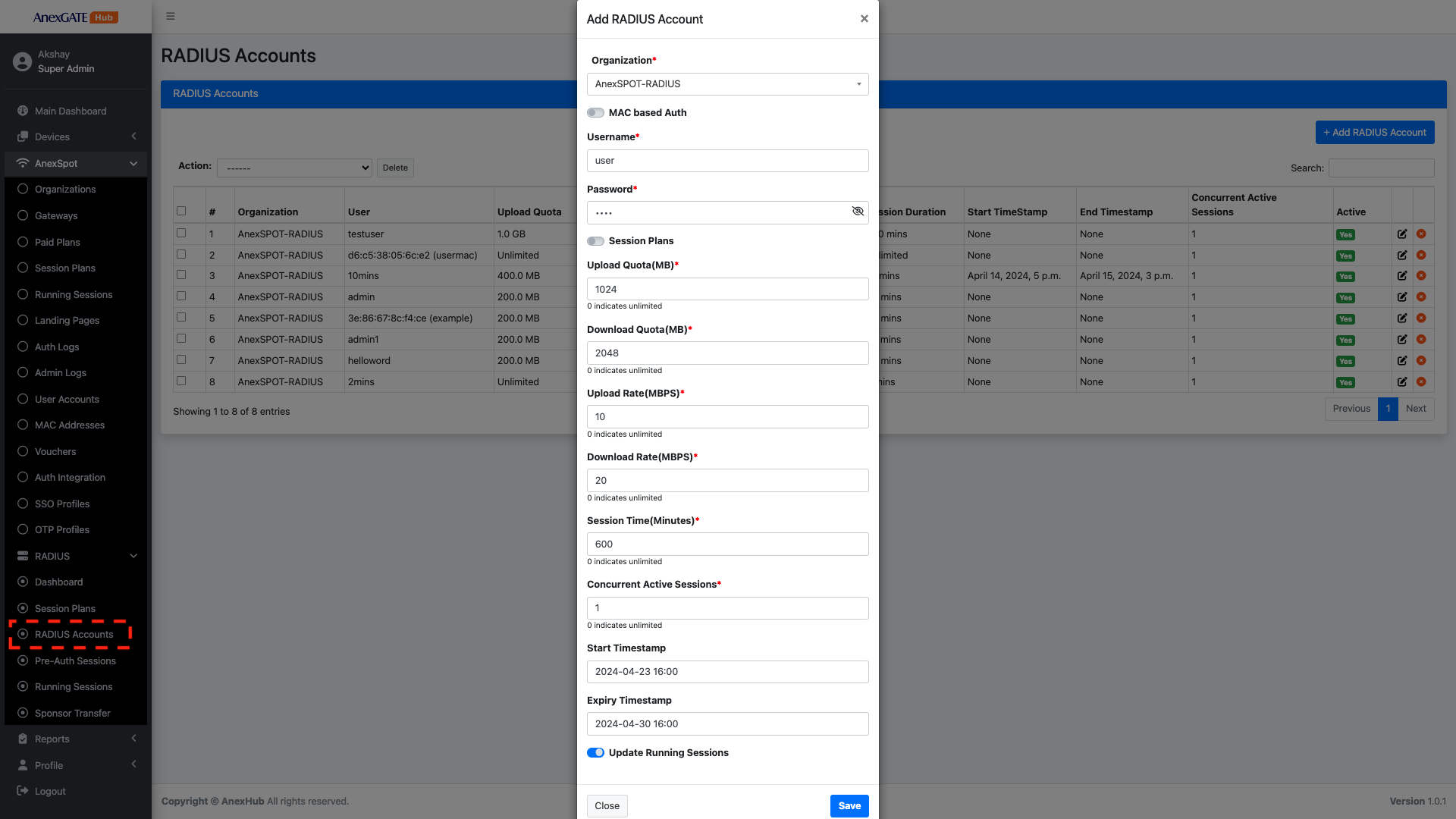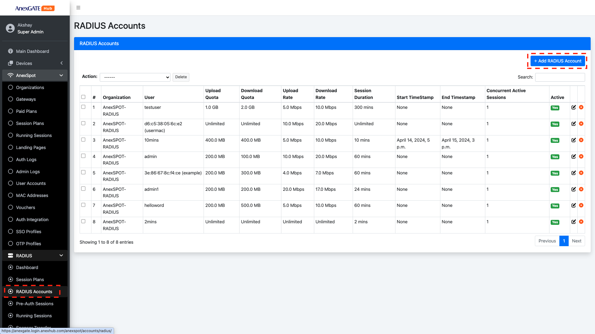AnexSPOT > RADIUS > RADIUS Accounts+Add Radius Account button located at the Top Right Corner.Username Based Auth with their respective networking parameters.