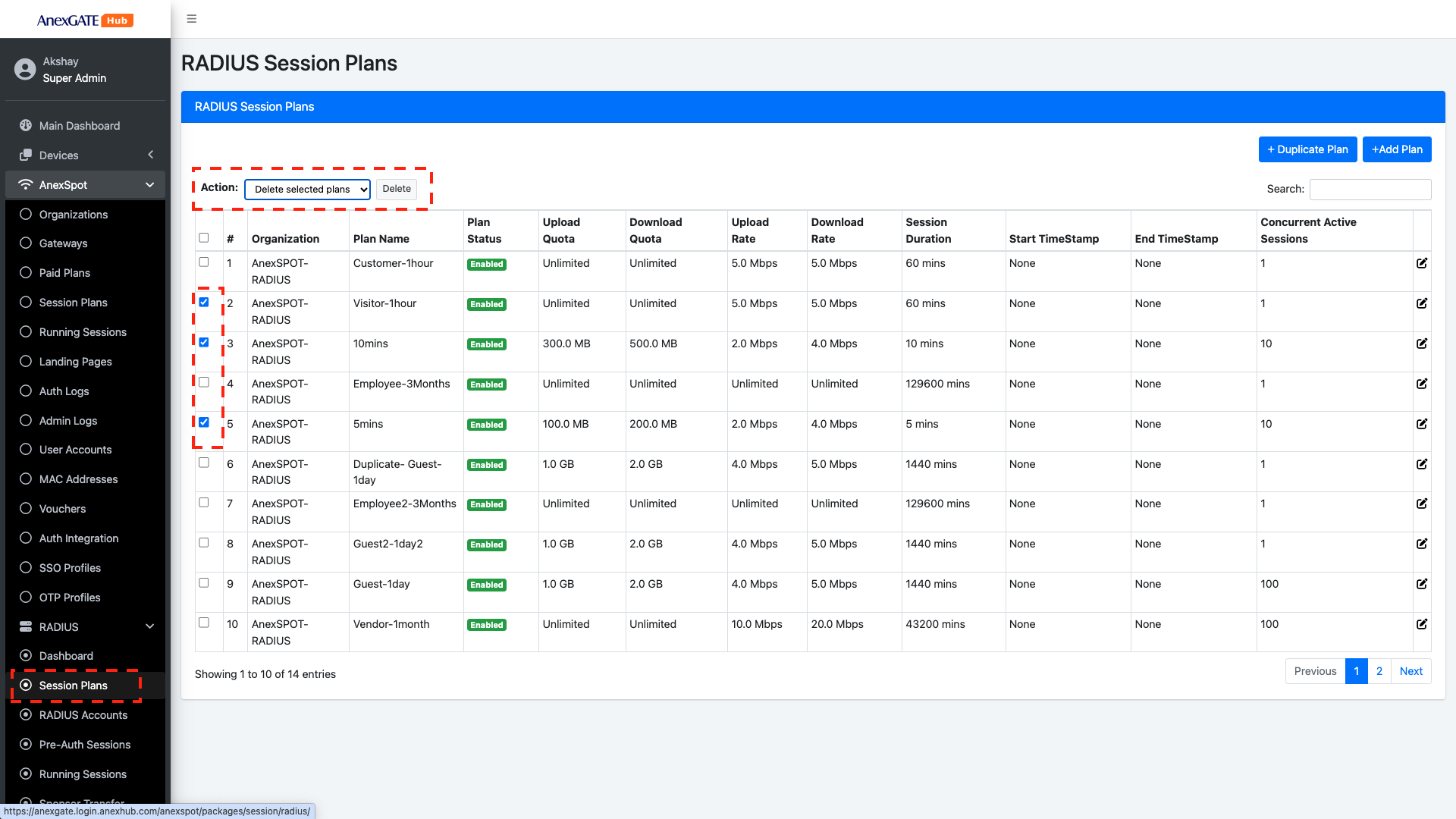 The configured Session plans can be deleted by selecting the plans and under Action Select Delete Selected Plans and click on Delete as shown in the image.