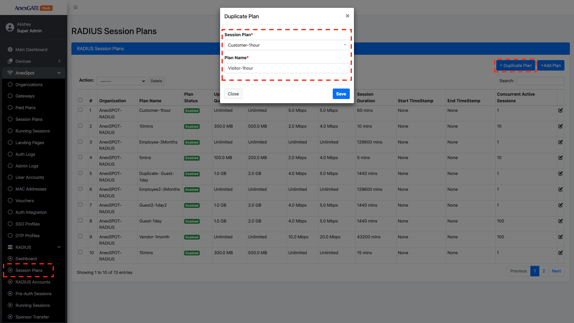 AnexSPOT - RADIUS - Session Plans+Duplicate Plan, located at the top right corner.Session Plan from the drop-down list that needs to be Duplicated and assign unique Plan Name for the Duplicated Session Plan.SAVE.