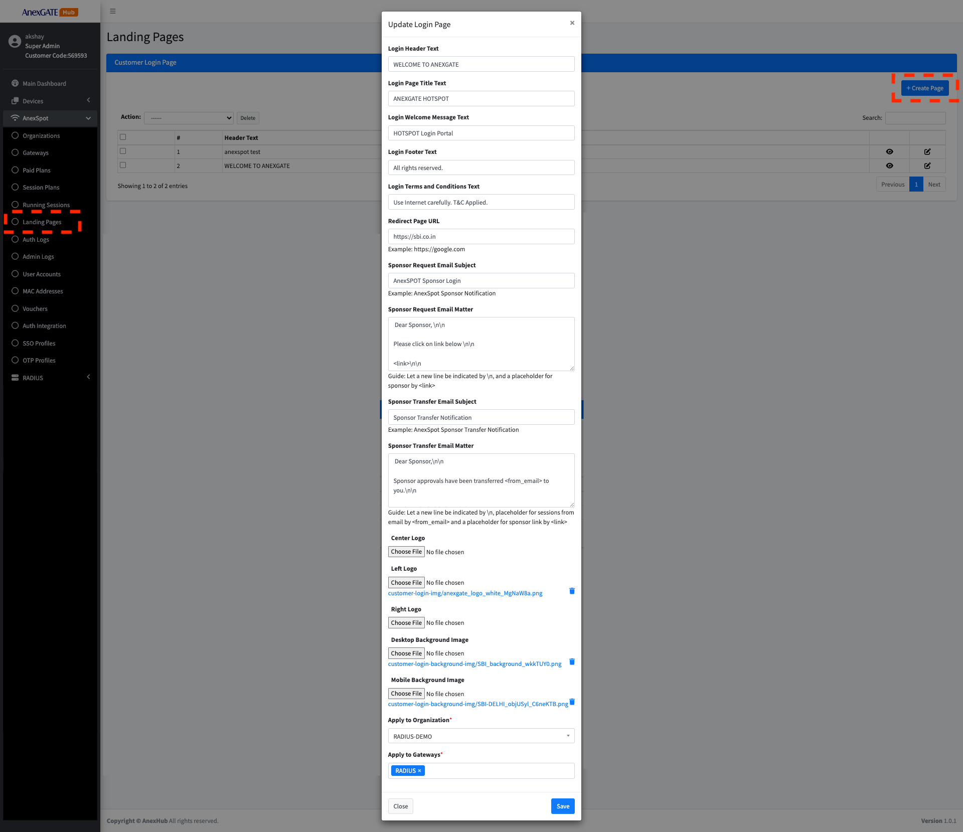 AnexSPOT > Landing Pages+ Create Page located at the top right end corner.Landing Page using given parameters.Following are the parameters to configure Custom Login Page -