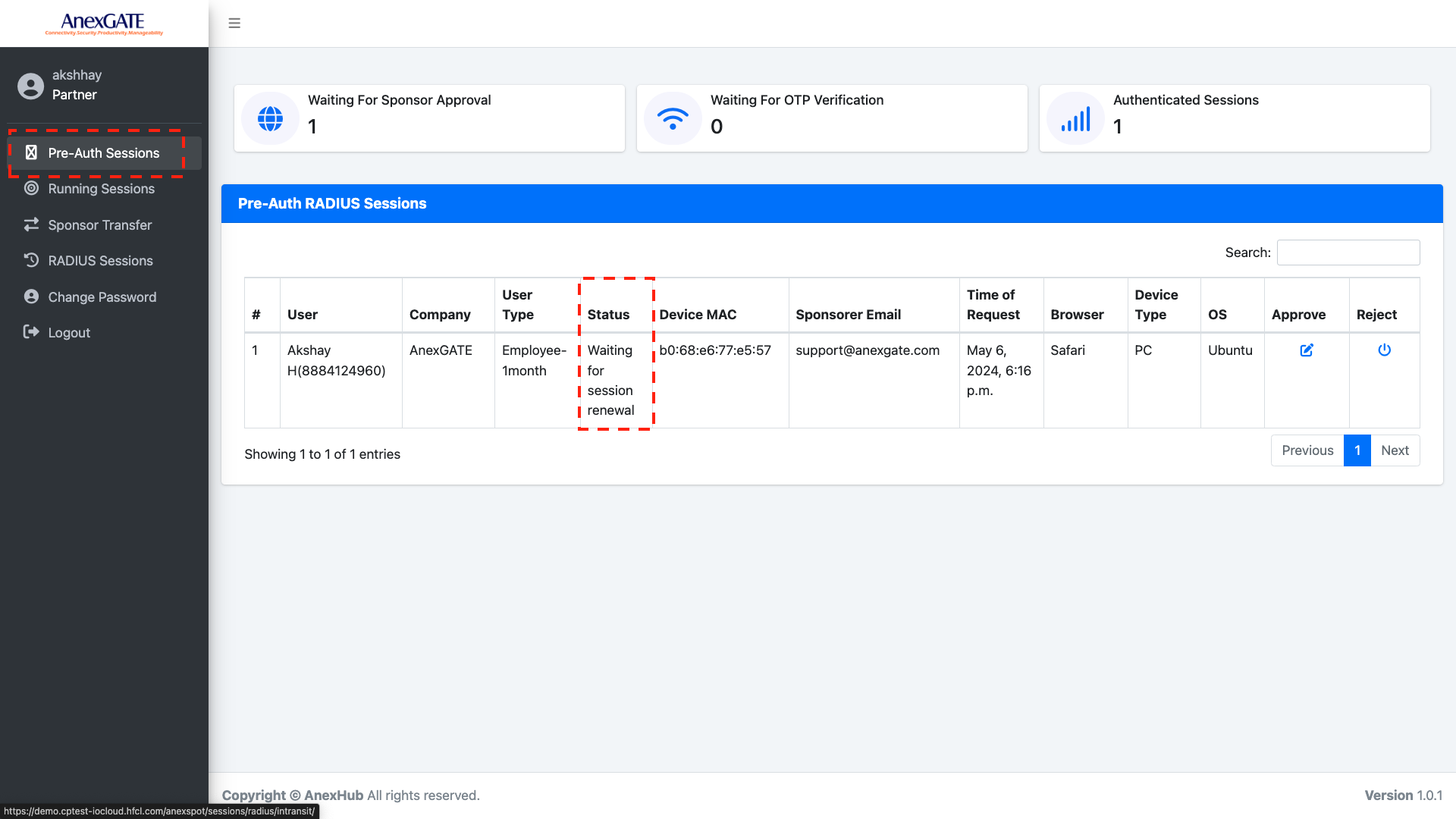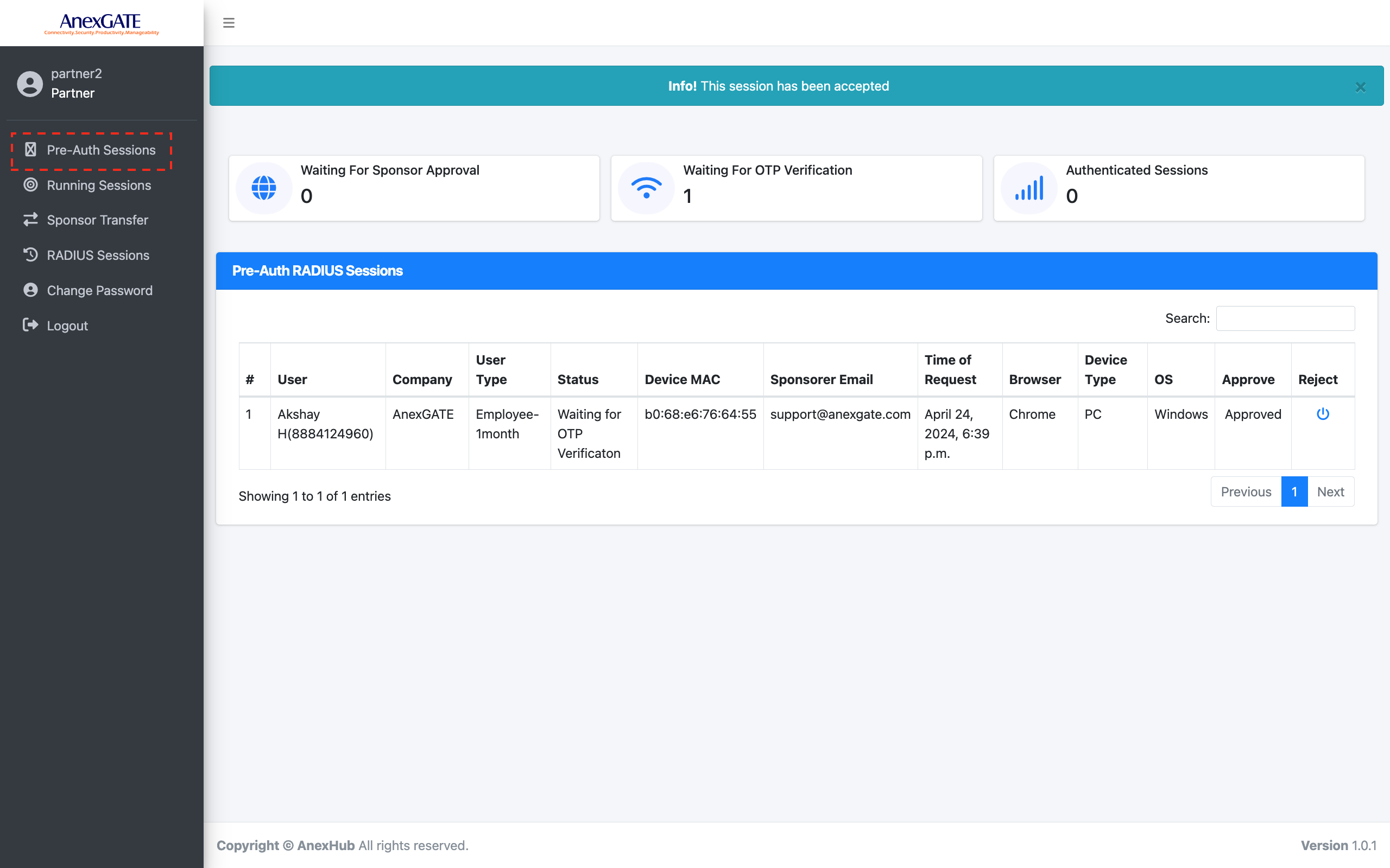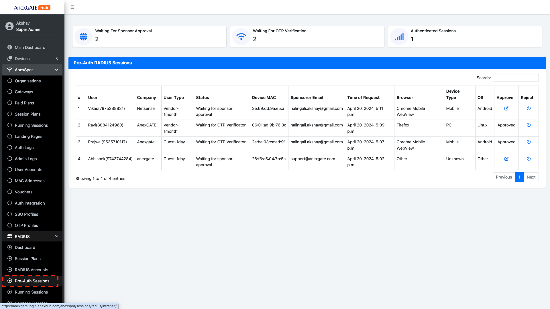 Once the sponsor has approved the request of the user. The Status is changed to WAITING FOR OTP Verification under Pre-Auth Sessions.