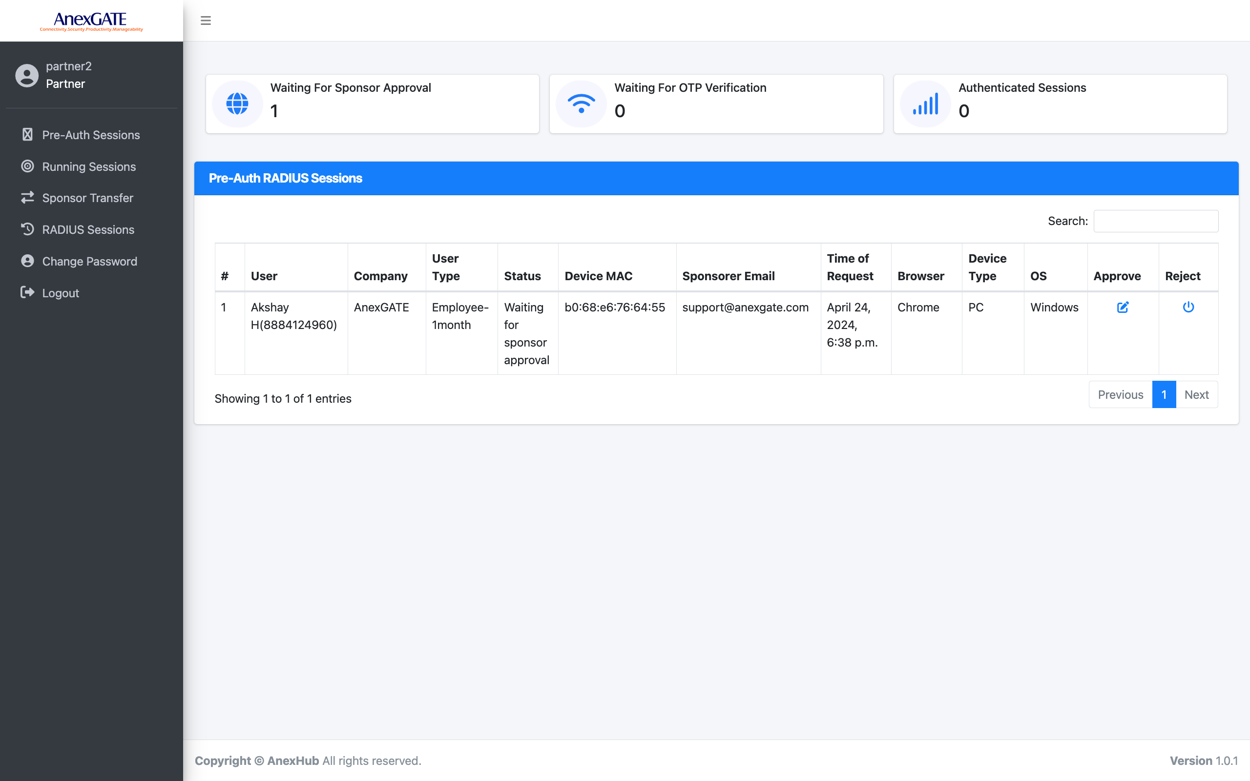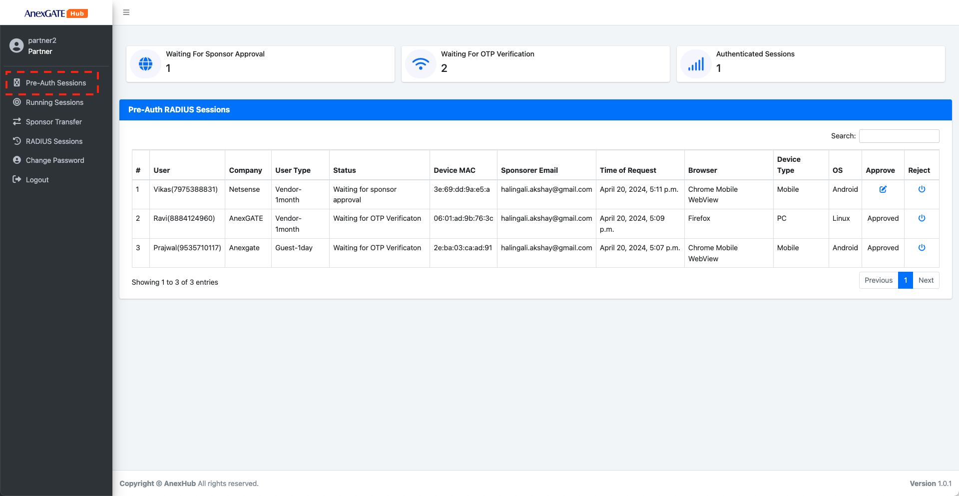 The Sponsor portal page will display the pre-auth session of the user with the status Waiting for Session Renewal. The partner portal admin can either Allow or Reject the session.
