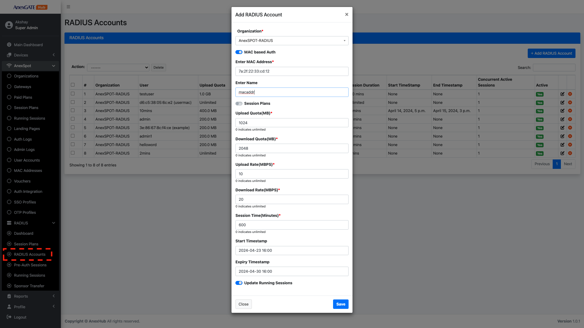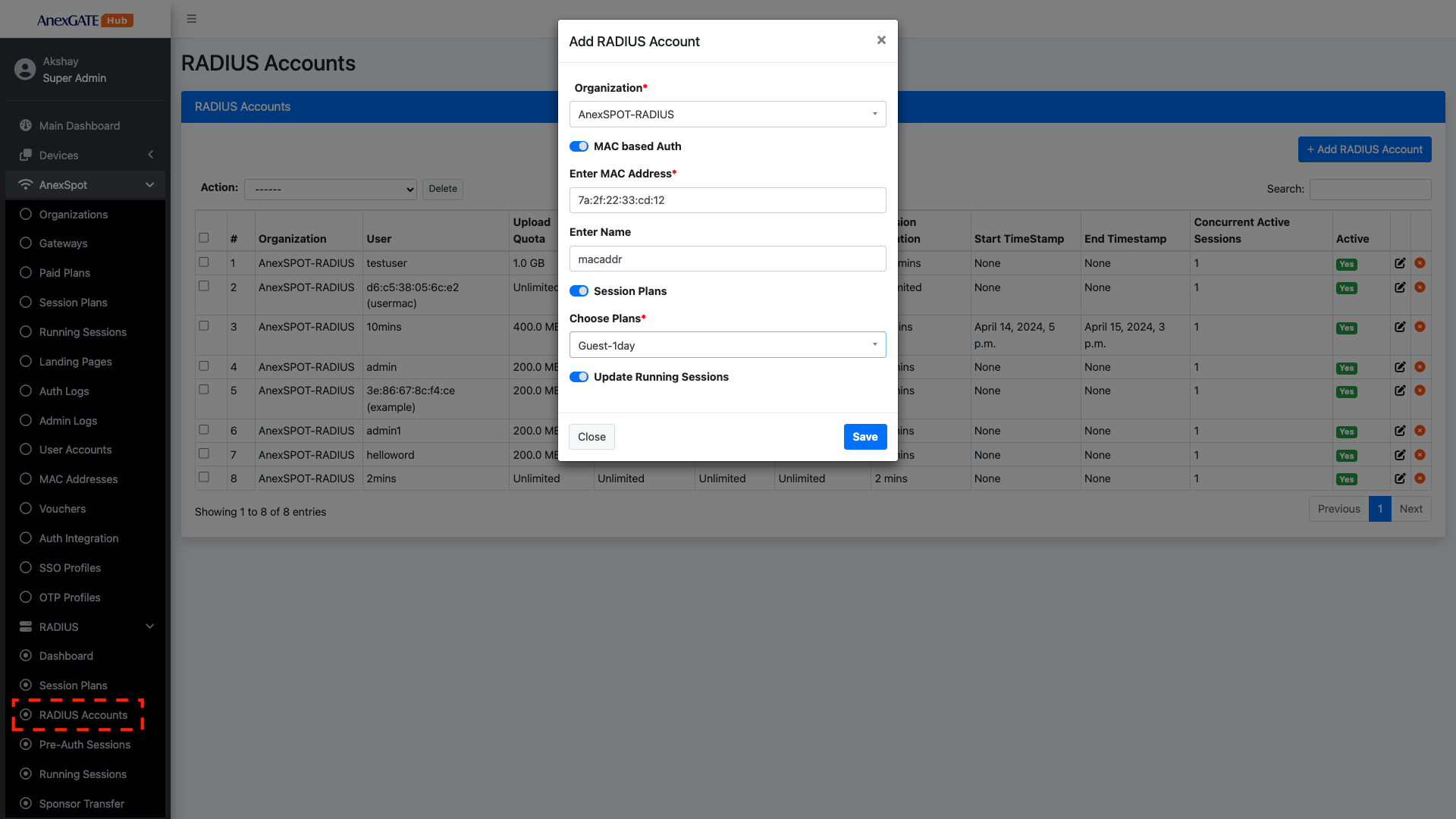 AnexSPOT > RADIUS > RADIUS Accounts+ Add Radius Account located at the Top Right Corner.MAC Address based Auth with their respective networking parameters.