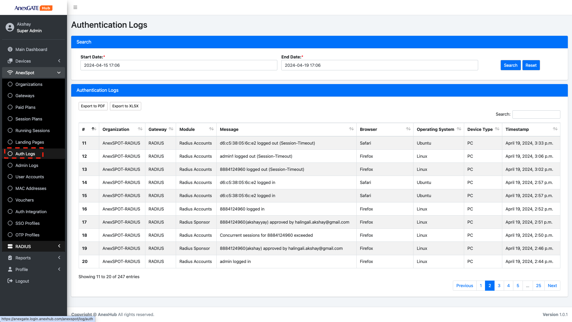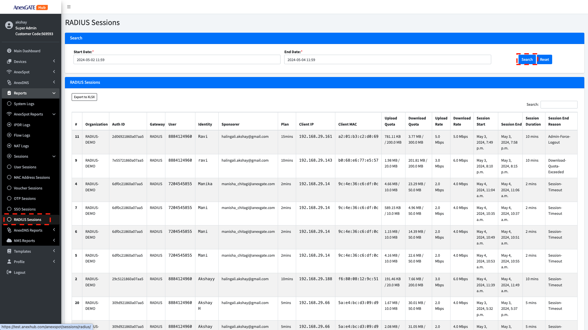 Reports > AnexSPOT Reports > Radius SessionsStart date and End date under Search to view older Radius Sessions.Radius Sessions logs can be exported in XLSX Format.Following are the radius parameters, that are displayed under RADIUS Sessions -