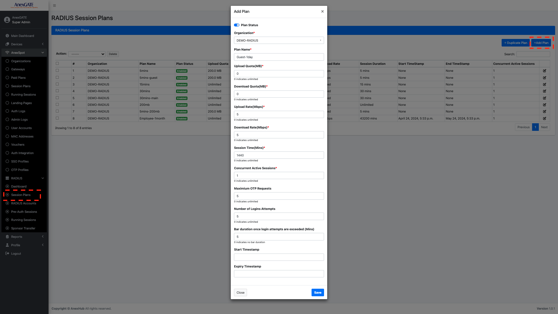 AnexSPOT - RADIUS - Session Plan+ADD Plan located at the top right end.Following are the parameters that can be configured as a network parameters -