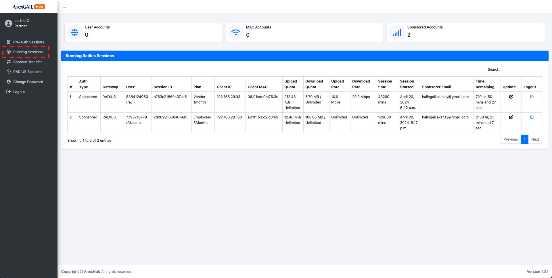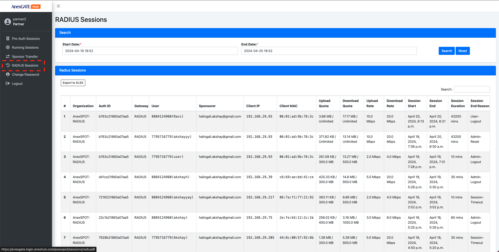 RADIUS Sessions display the detailed report of old sessions which have been logged out.Radius Sessions in Partner Account will display only specific radius sessions which have been approved by the partner/sponsor user account.