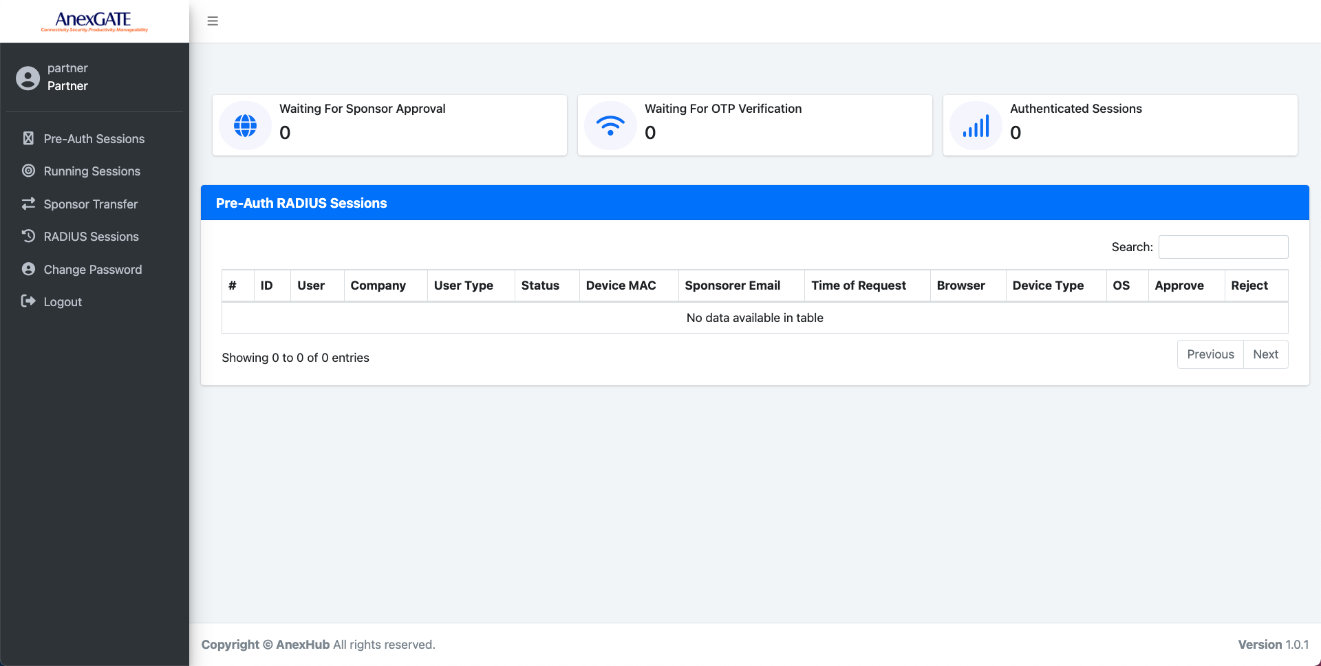 RADIUS Pre-Auth Sessions are the sessions captured by the RADIUS server where User submits required information and provides a valid Sponsor mail and requests for the Internet Access. Once the required information has been sent to the sponsor. The Sponsor will have a authority to ACCEPT or DENY the received request for Internet Access.